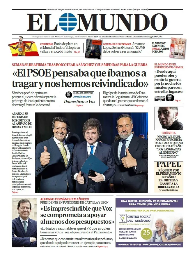 Portada de EL MUNDO del domingo 22 de marzo de 2026. Disponible en Orbyt desde las 23.30h. y cada día en tu quiosco, la mejor información siempre con EL MUNDO. Suscríbete aquí a PREMIUM y tendrás acceso ilimitado a todo el contenido...
