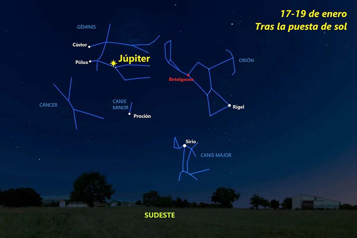Durante el mes de enero, Júpiter se muestra iluminado frontalmente por el Sol y a su mínima distancia de la Tierra...