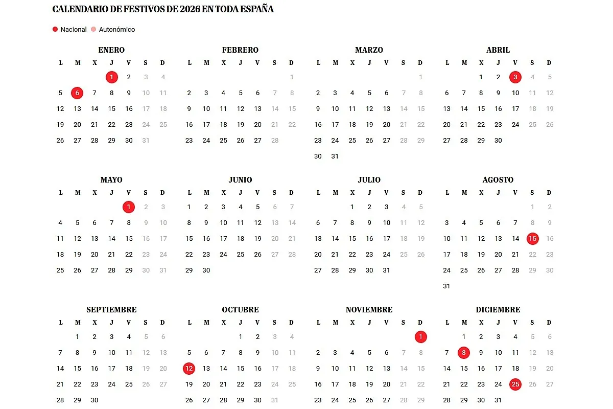 Calendario laboral 2026 de España: todos los días festivos y puentes