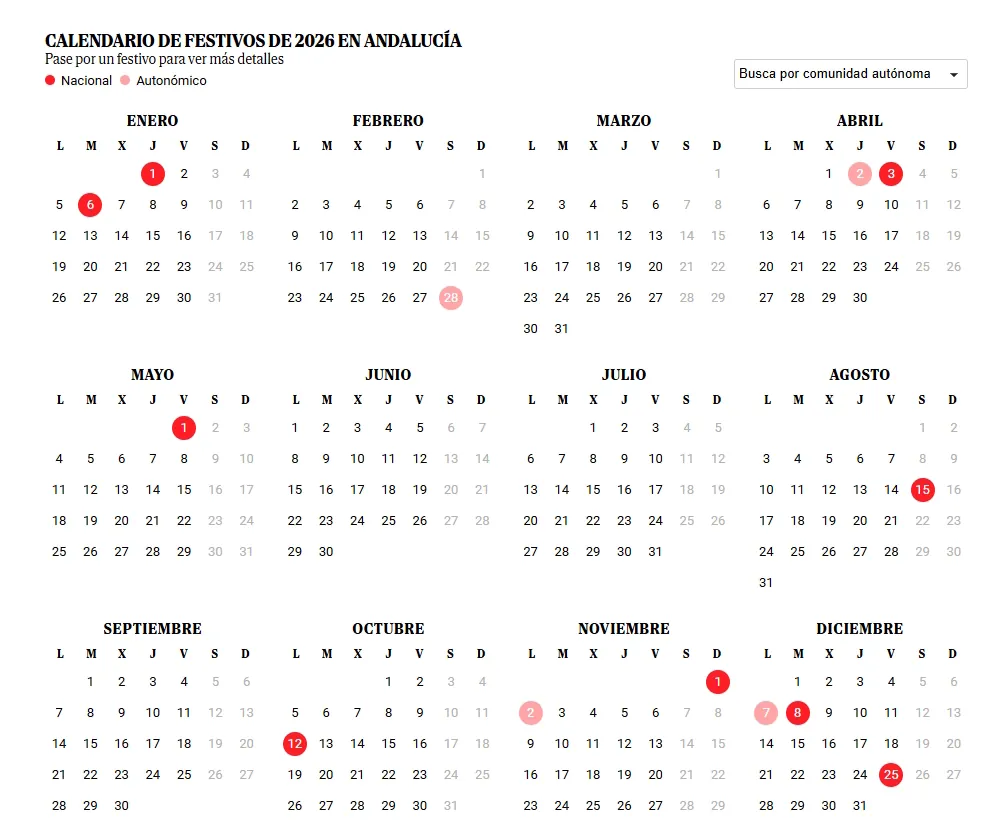 Calendario laboral de Andalucía 2026: días festivos y puentes