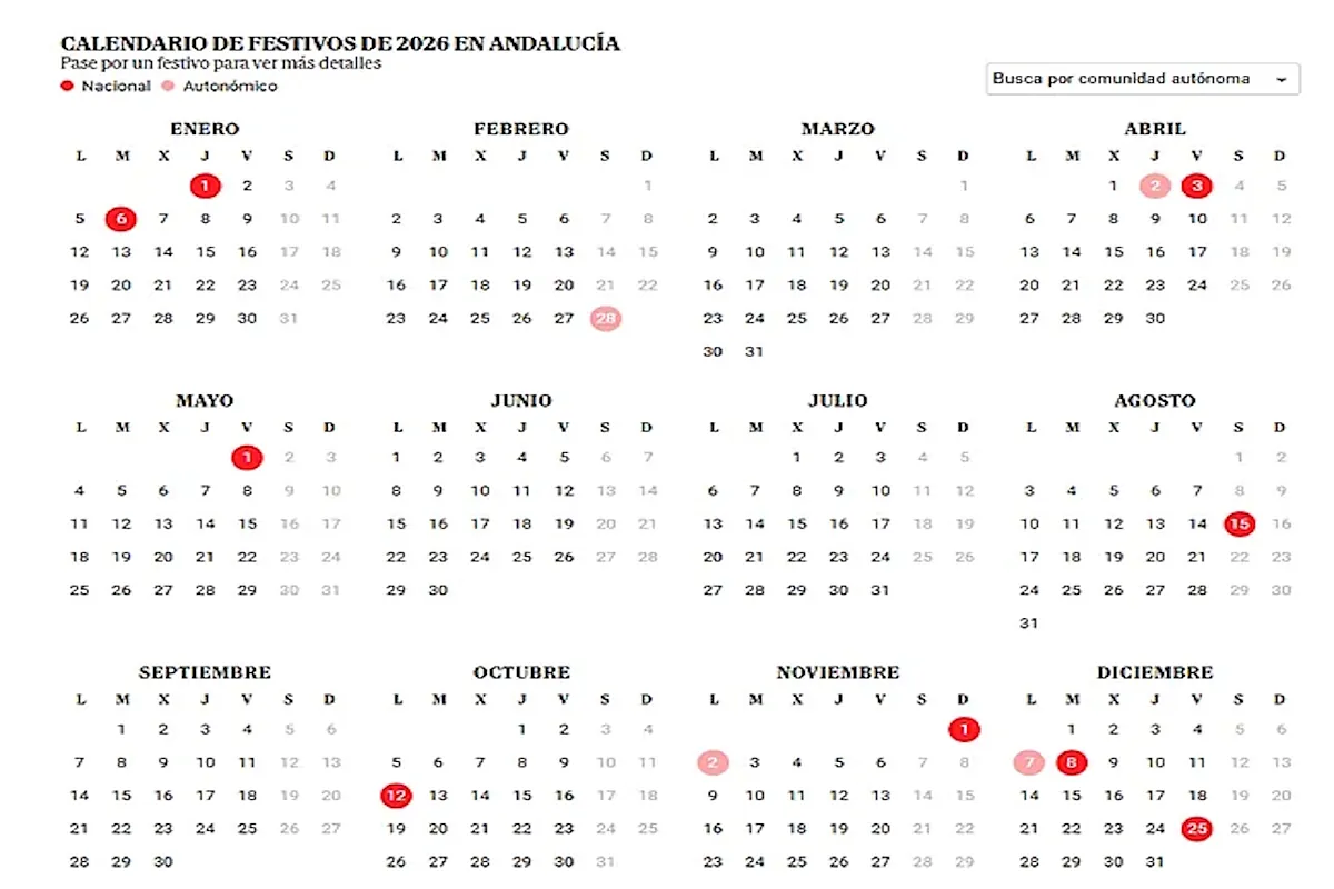 Calendario laboral de Andalucía 2026: días festivos y puentes