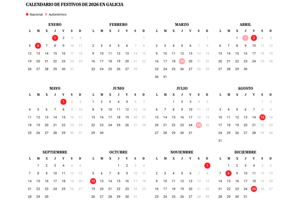 Festivos Galicia 2026: calendario laboral y puentes