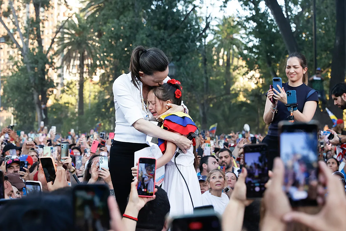 Con nueve millones de venezolanos repartidos por todo el mundo, por donde sea que pasa la Nobel de la Paz se encuentra con unos cuantos. La última gran cita con su gente fue en Chile, donde residen 700.000 de sus paisanos, que aún esperan por la democracia que les hará volver...