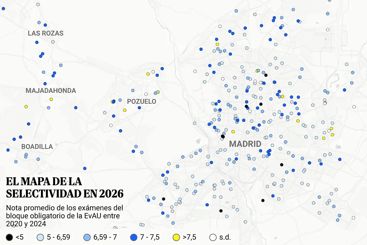 El mapa, calle a calle, de las mejores y peores calificaciones de la PAU en los 674 institutos y colegios que ofrecen Bachillerato en la región...