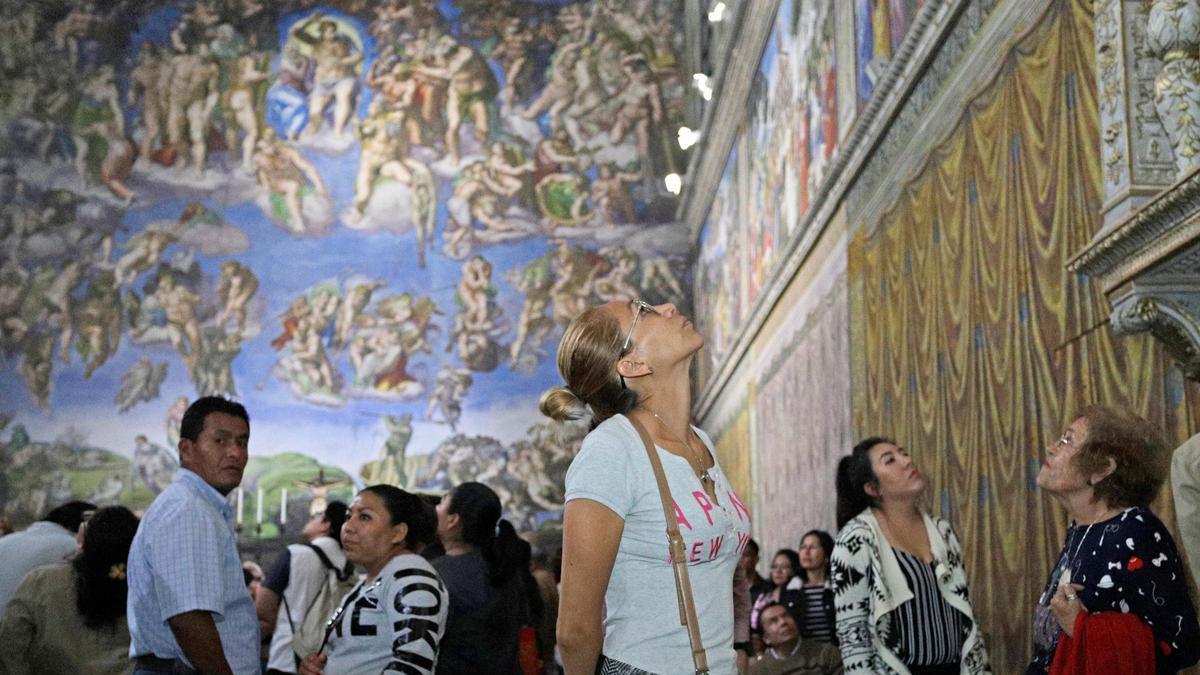 El público sigue entrando a esta preciosa estancia donde se celebran los cónclaves que eligen a los papas, pero una de sus grandes pinturas, el 'Juicio Final' de su ábside, permanece ahora tapada por un andamio...