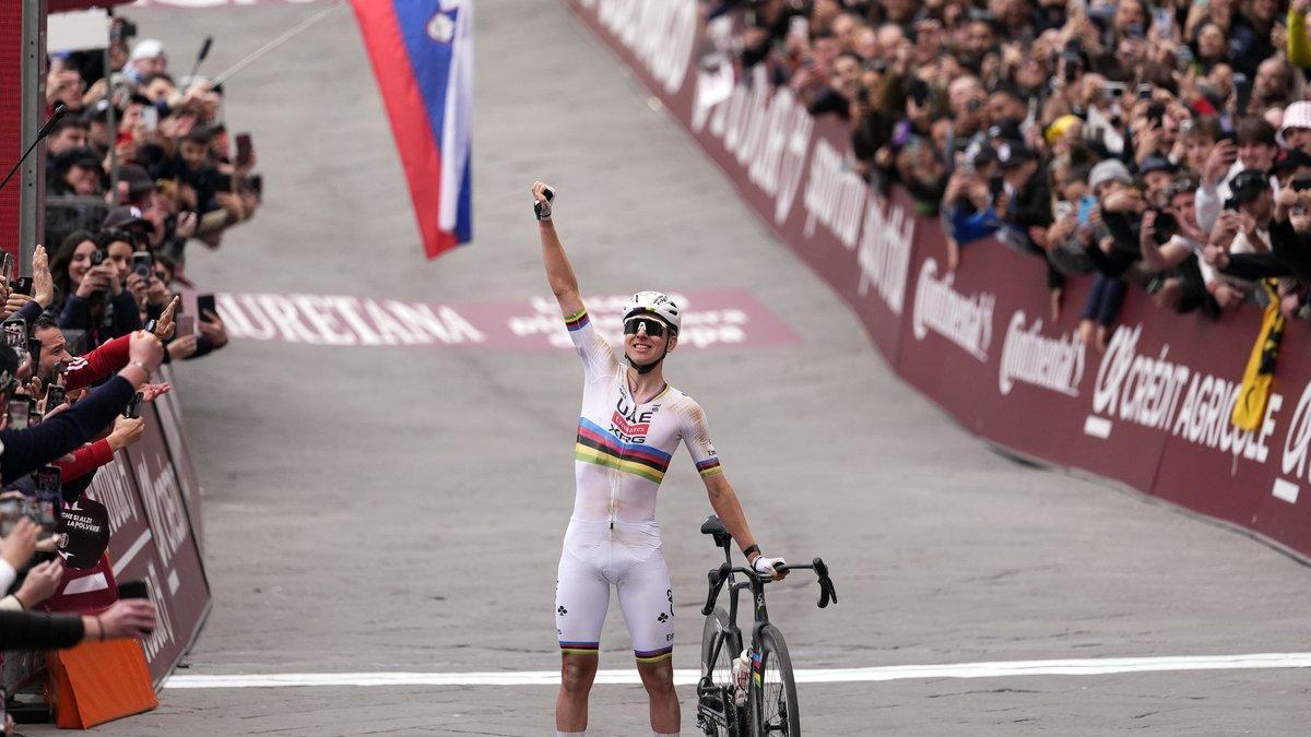 Enorme victoria del fenómeno esloveno en la Strade Bianche tras atacar a 79 kilómetros de la meta y ganar por delante del portento francés Paul Seixas y de su compañero mexicano Isaac del Toro....