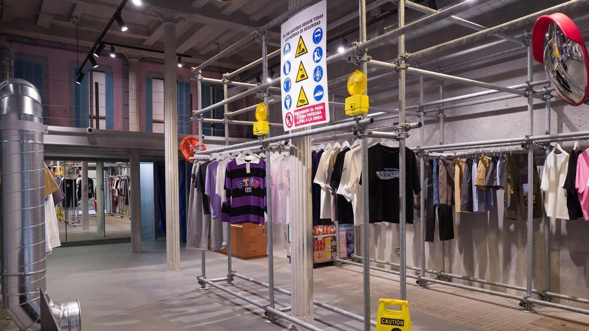 Tras hacerse viral por su estética a lo supermercado, SSSTUFFF cambia radicalmente y se transforma en un local en construcción: ahora hay andamios, tuberías, ladrillos, hasta las cortinas de los probadores son tela de obra....