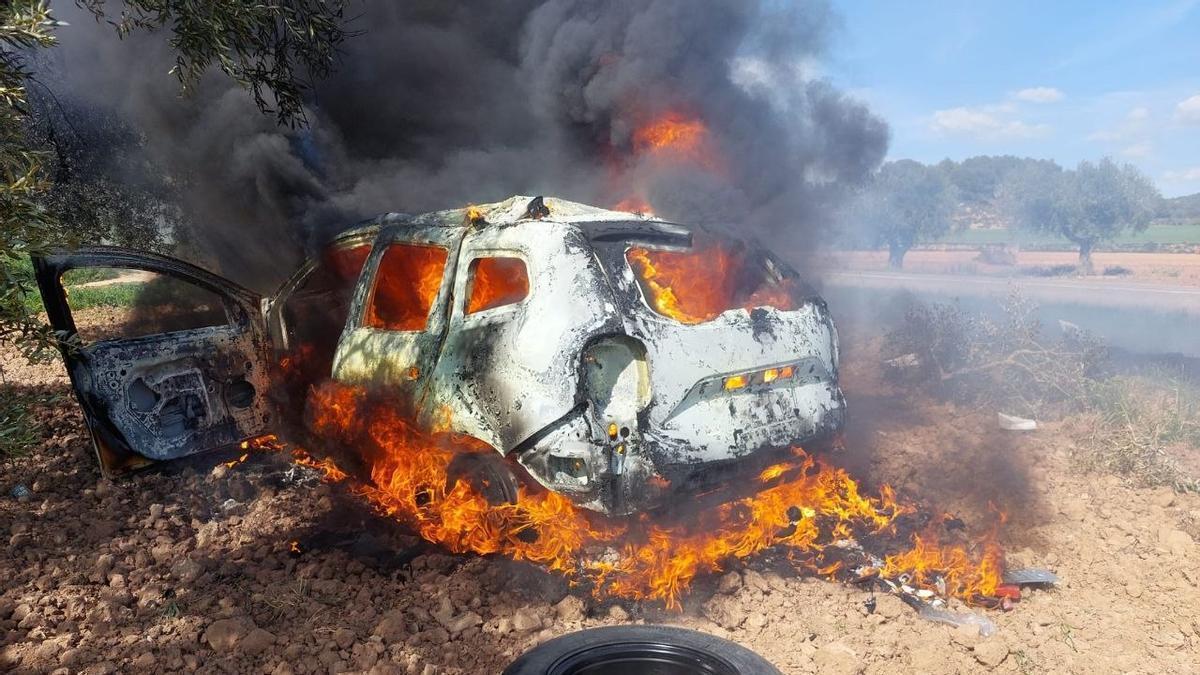 Choca con un coche tras un adelanto temerario en la C-14 y provoca que de dos vueltas de campana y se incendie