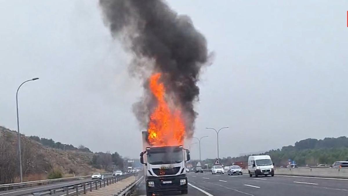 El aparatoso incendio de un camión deja retenciones en la A-3 en Rivas durante horas