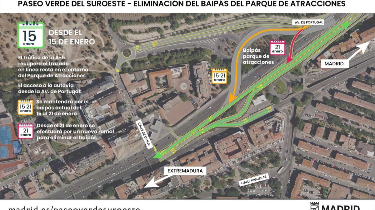 El soterramiento de la A-5 elimina el baipás del Parque de Atracciones y recupera el trazado en línea recta desde este jueves