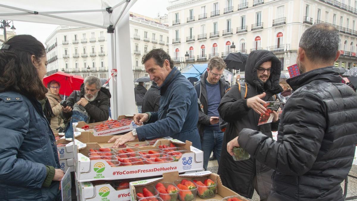 La Puerta del Sol se llena de fresas gratis: agricultores reparten 2.000 tarrinas para defender el cultivo en Madrid