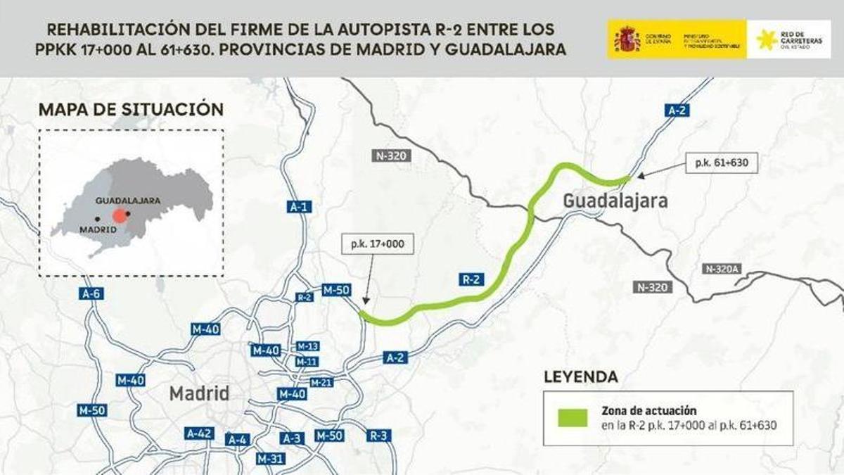 Obras en la R-2: el Gobierno invertirá 21 millones de euros para mejorar el firme entre el aeropuerto de Torrejón y Guadalajara