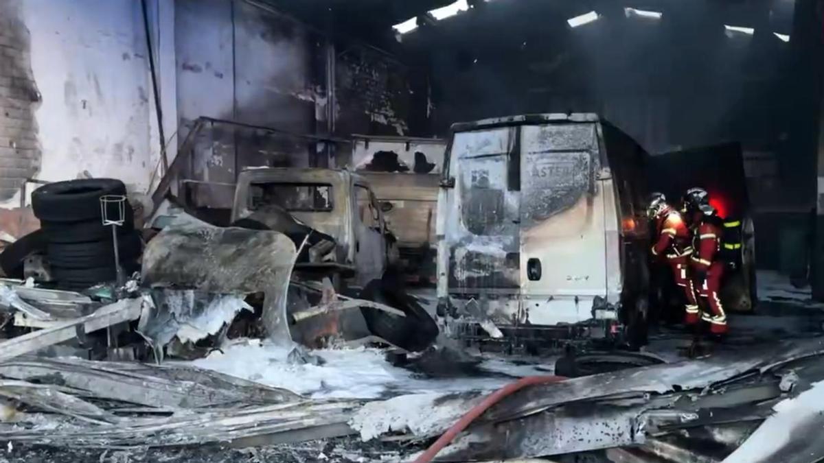 Un aparatoso incendio quema varios vehículos en un taller de camiones de San Fernando
