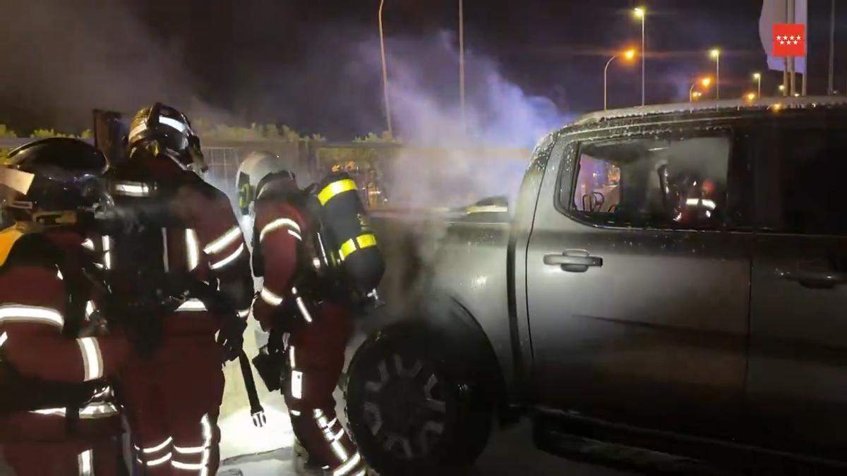 Varios vehículos arden en el exterior de un concesionario de Leganés: los bomberos extinguen las llamas