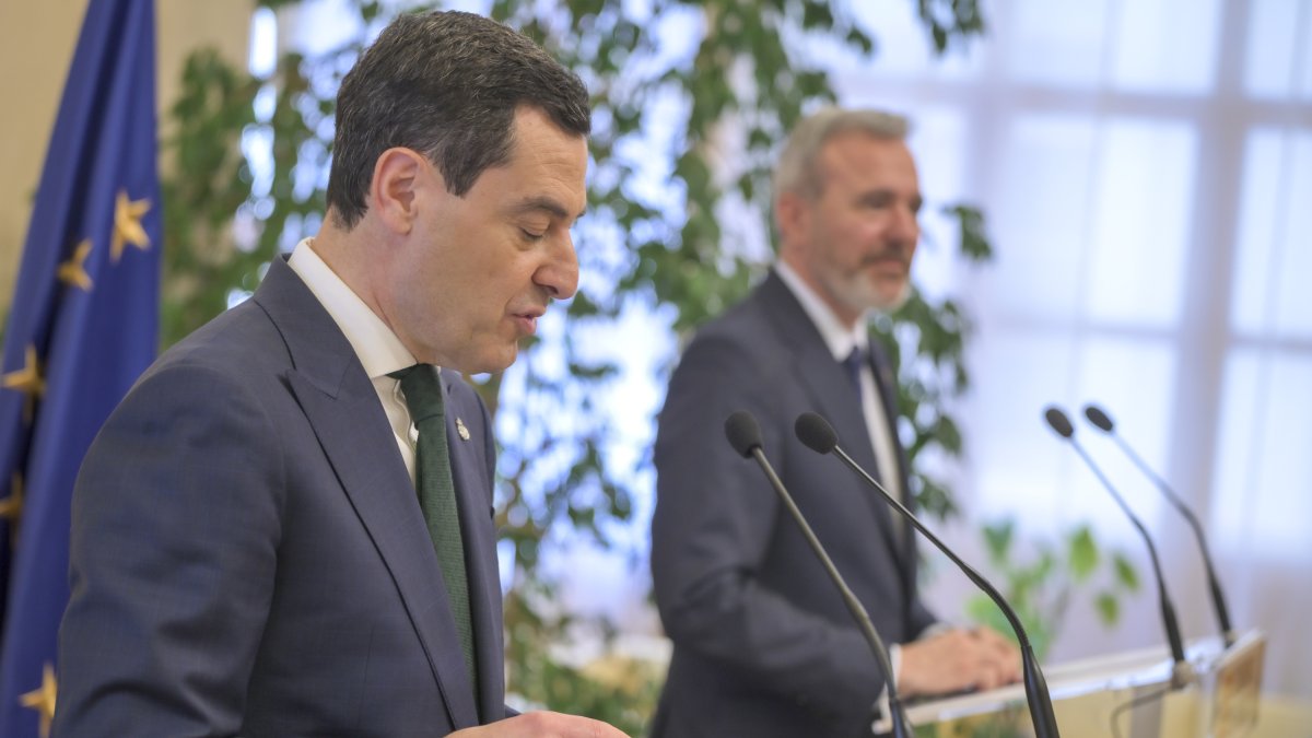 El presidente andaluz ha sido preguntado por las polémicas declaraciones de su homólogo en Aragón comparando el físico de Pilar Alegría y María Jesús Montero....