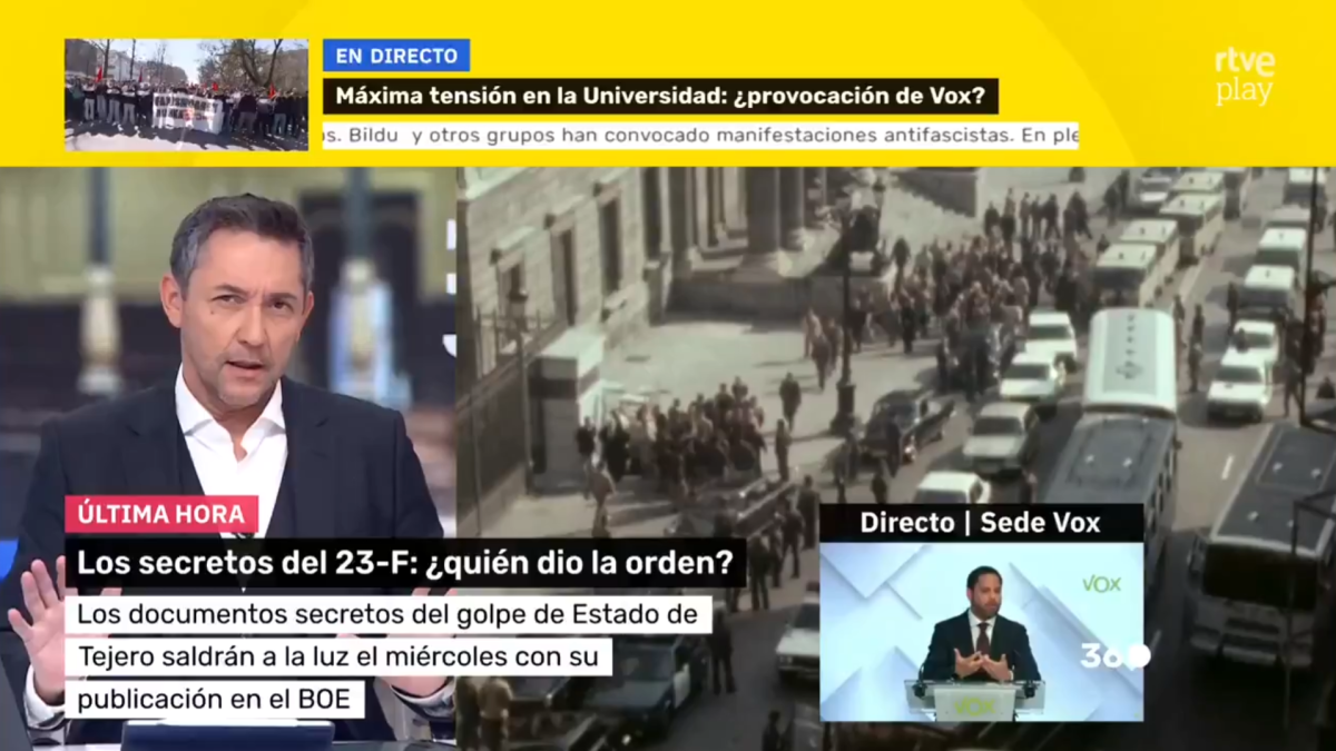 Javier Ruiz desata la polémica en TVE al vincular el 23-F con el acto de Vox en Vitoria