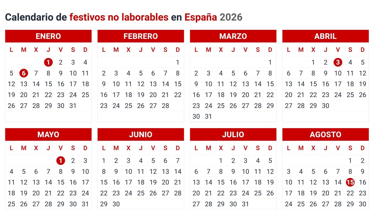 El año 2026 contará con 12 días festivos, 9 comunes en toda España
