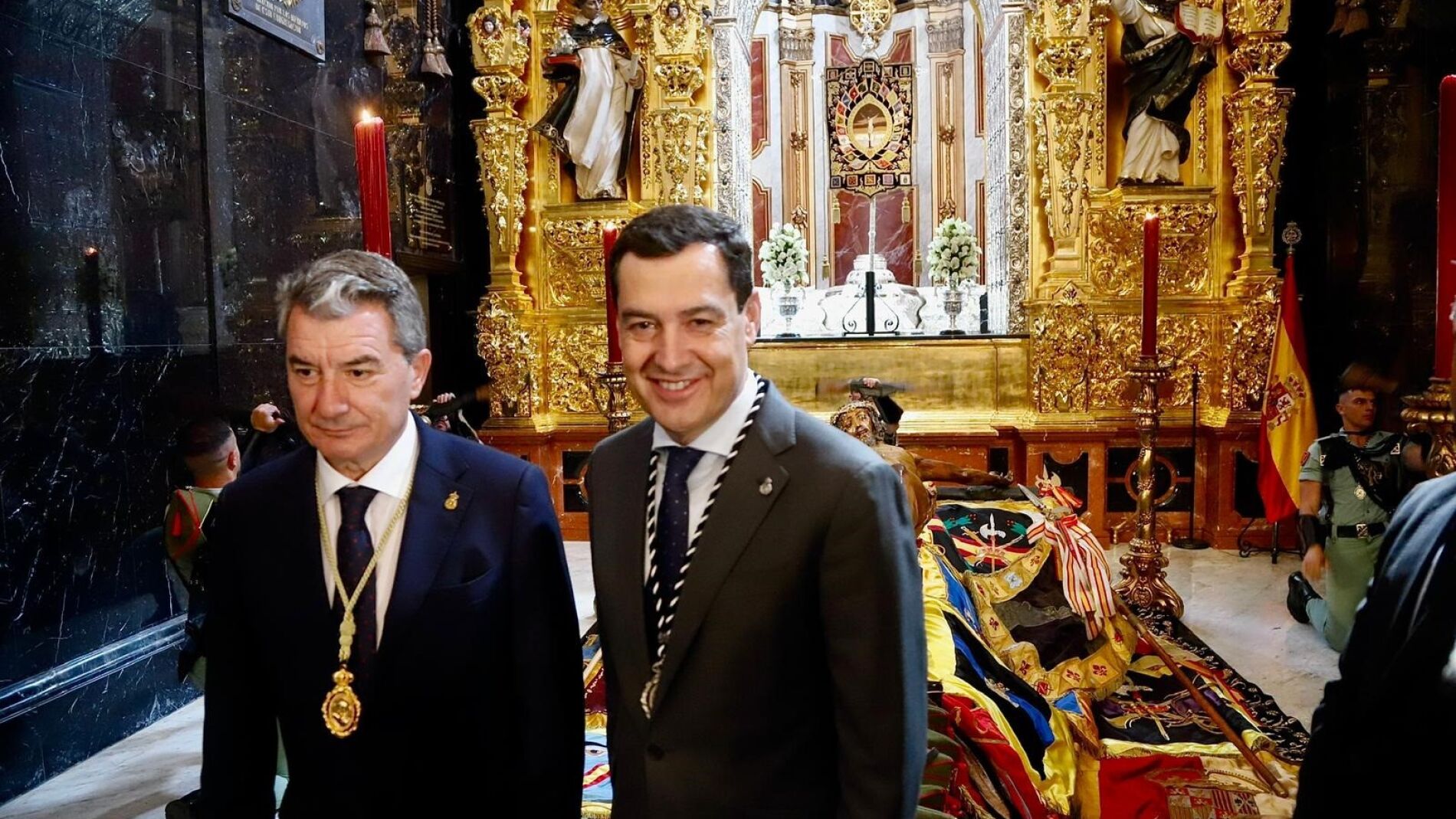 Juanma Moreno vuelve a portar "con ilusión" y fe al Cristo de la Exaltación en Málaga