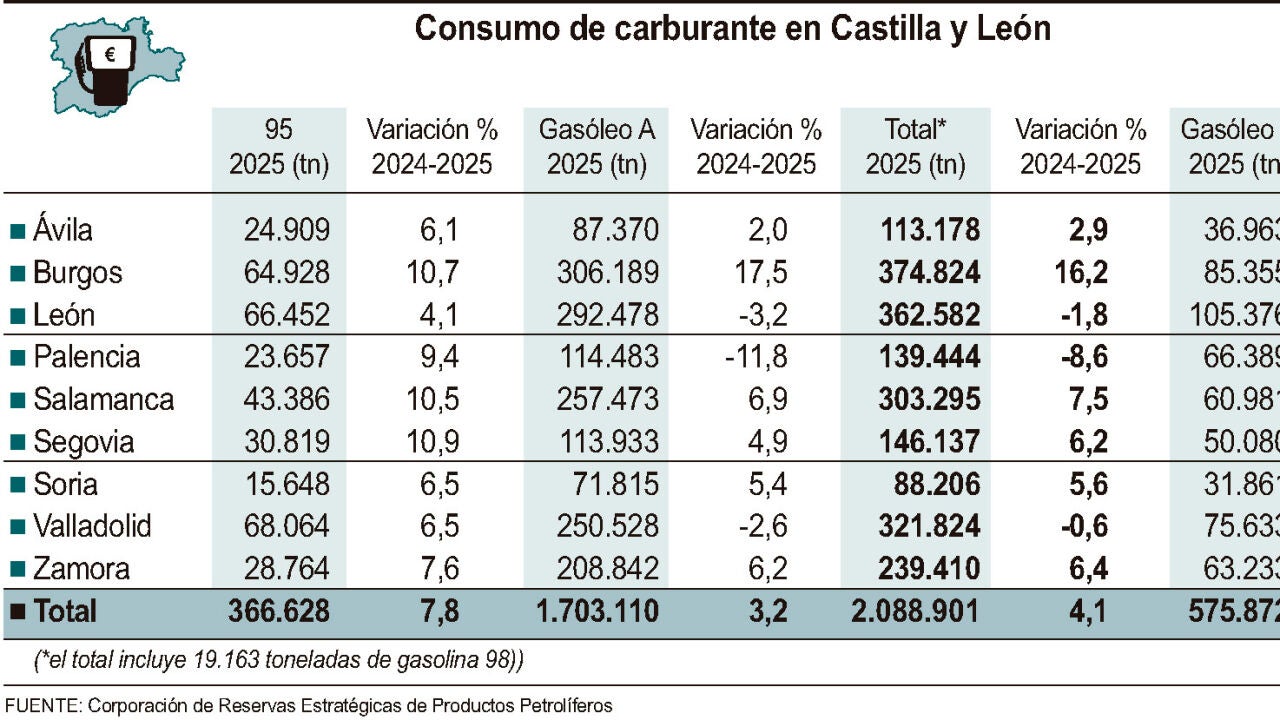 El consumo de carburantes acompaña al ciclo económico y crece un 4,1% en 2025 en Castilla y León, hasta casi 2,1 millones de toneladas