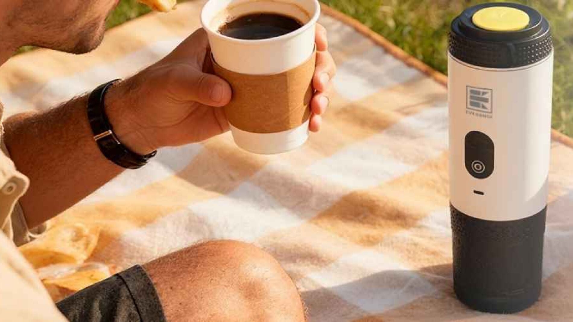 Una cafetera compacta con batería y pantalla que permite preparar espresso tanto con café molido como con cápsulas sin depender de enchufes...