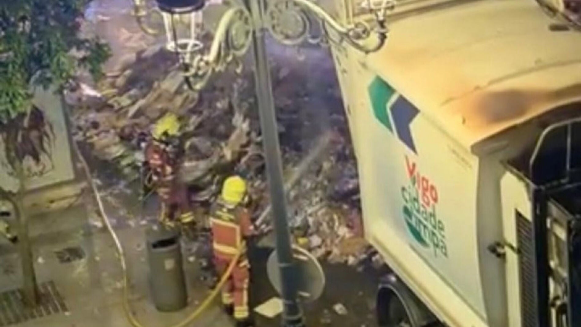 Arde un camión de basura en plena madrugada en Vigo y obliga a vaciar su carga para sofocar el fuego