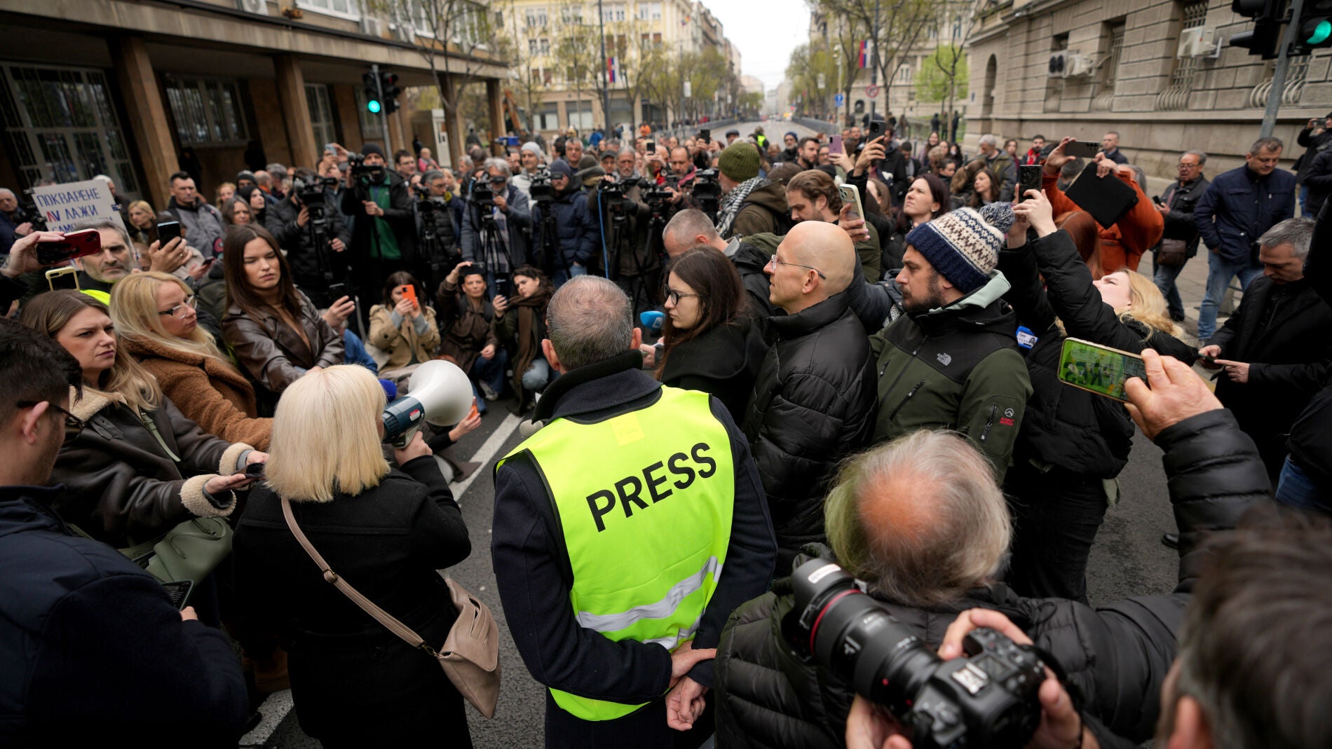 Decenas de profesionales de la información se concentran frente a la Presidencia serbia para denunciar la escalada de violencia y exigir responsabilidades al Gobierno de Aleksandar Vučić...