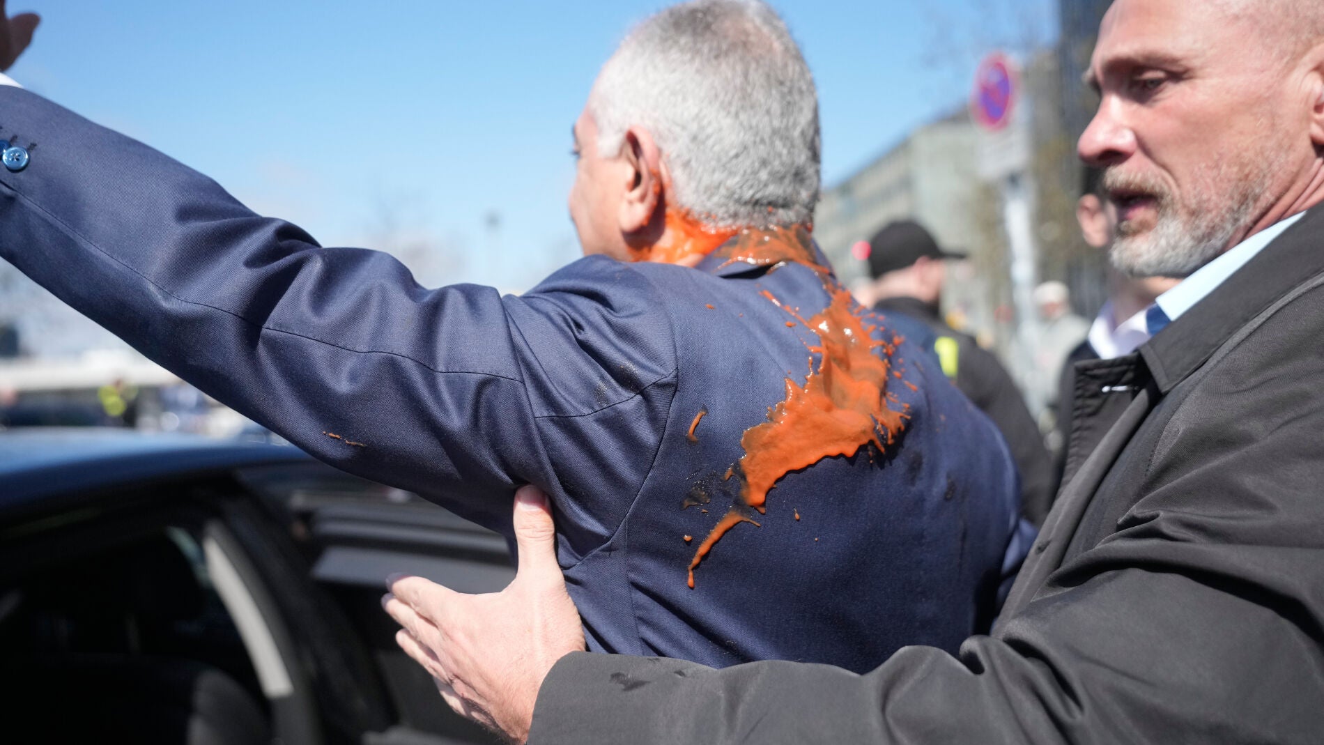 Un hombre se acercó a la comitiva del hijo del sha, rodeado en ese momento de agentes de seguridad y de fotógrafos, y le arrojó sin mediar palabra el líquido rojo, para ser inmediatamente inmovilizado por los guardias, que posteriormente le entregaron a la policía...