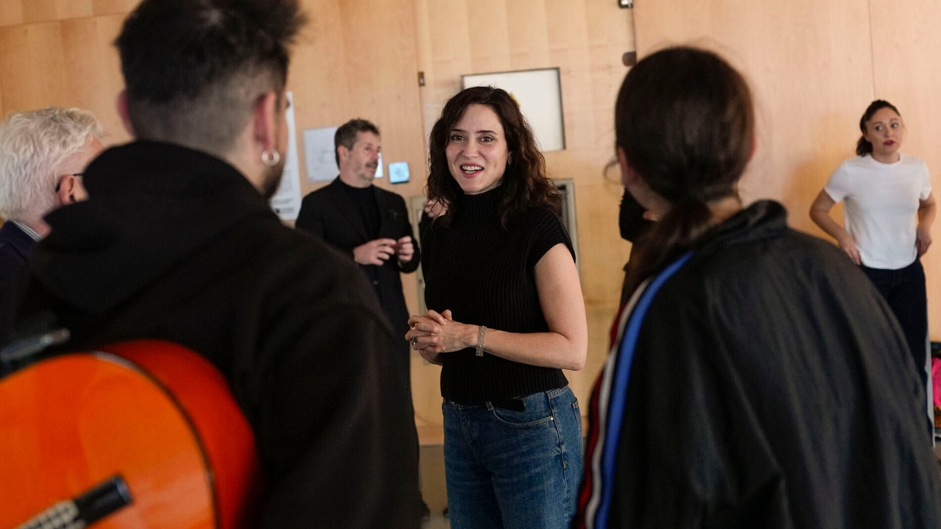 Isabel Díaz Ayuso redefine el look working: vaqueros rectos y jersey negro, el uniforme infalible de entretiempo