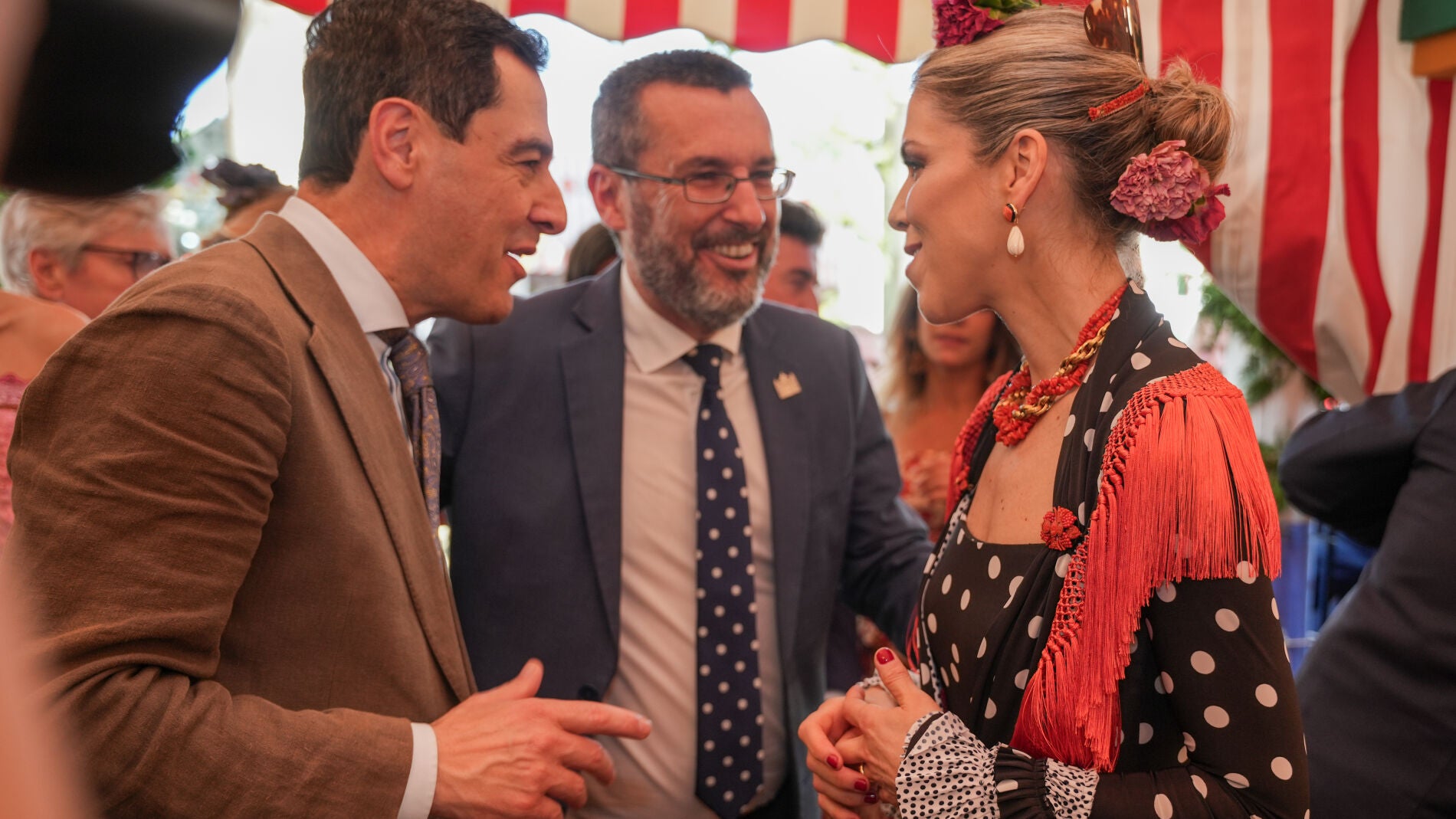 La esposa de Juanma Moreno apuesta en su segundo día en el Real por un diseño contemporáneo firmado por José Hidalgo, con lunares bicolor, volantes en zigzag y claveles rojos que confirman su dominio del código flamenco más elegante...