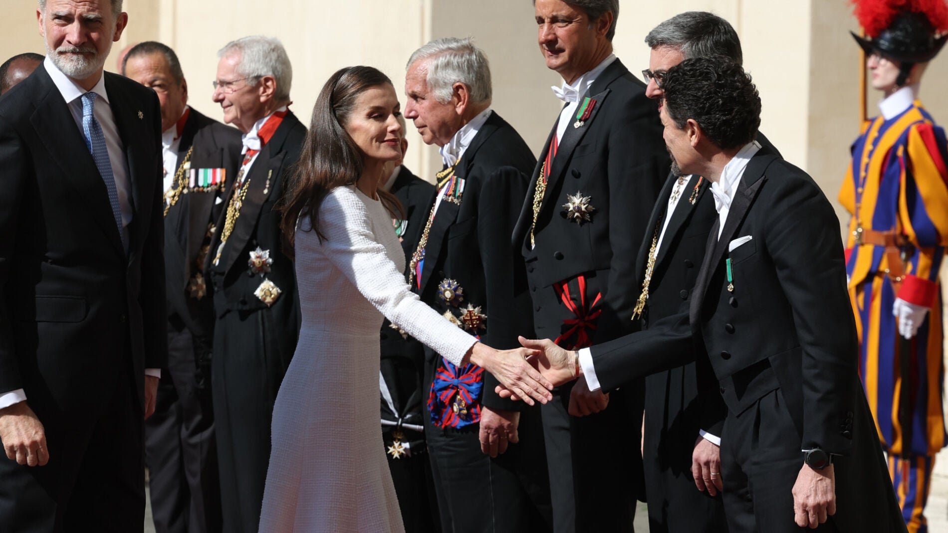 La monarca reaparece en Roma junto al Rey Felipe VI con un impecable diseño blanco, posiblemente de las costureras de Palacio, reinterpretando el protocolo más exclusivo con un look sobrio, moderno y sin mantilla....