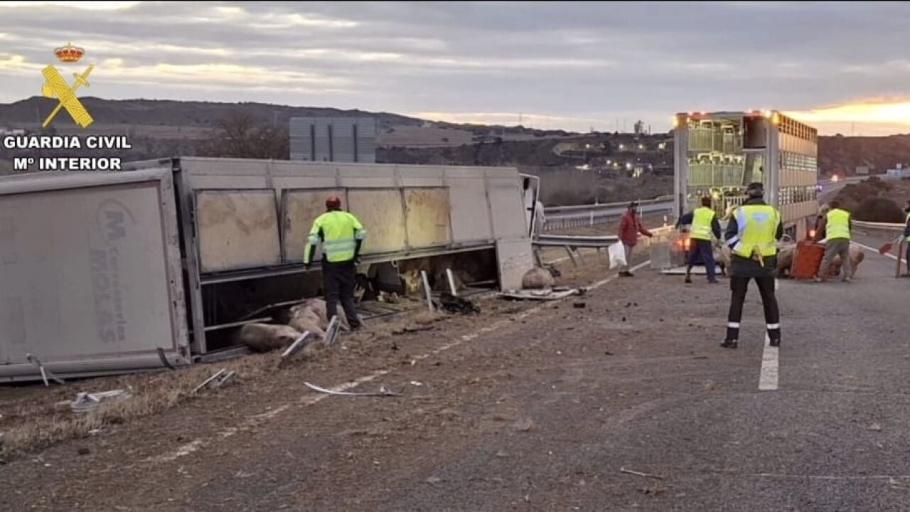 Vuelca un camión lleno de cerdos y obliga a cortar la autovía A-22