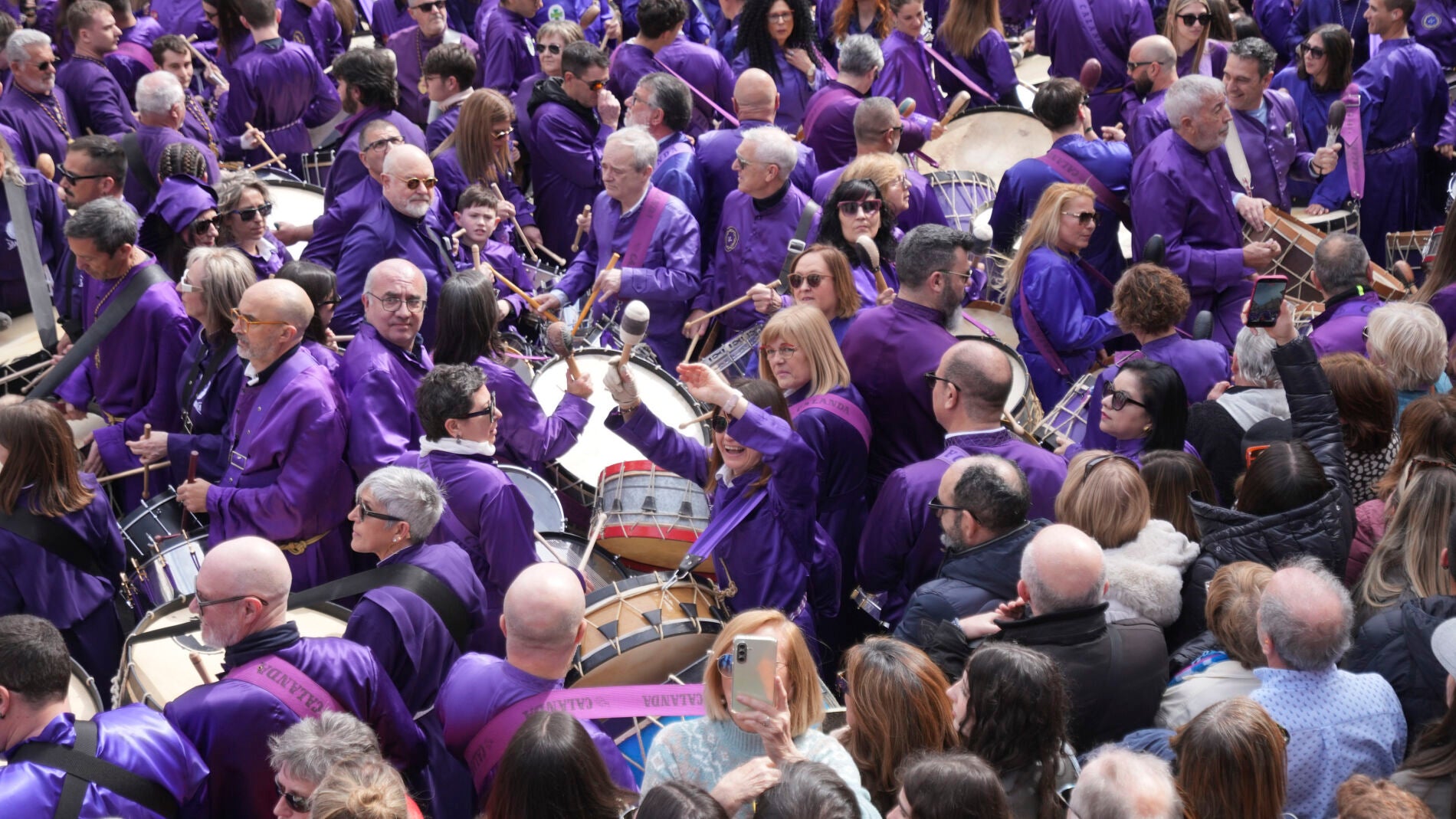 La plaza de España de Calanda, completamente abarrotada y teñida de morado por el color de las túnicas...