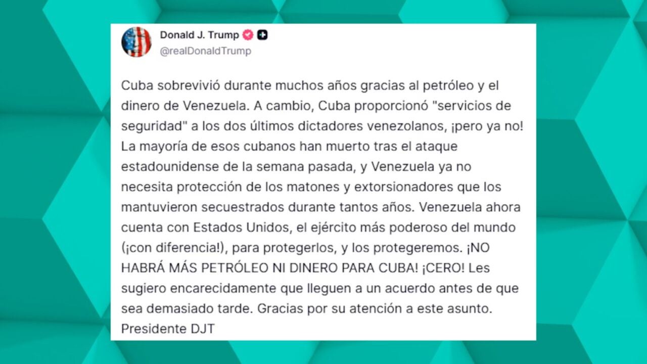 El contexto El presidente estadounidense ha expuesto en su red social que a cambio de riquezas, los cubanos proporcionaron 'servicios de seguridad' a los dos últimos dictadores venezolanos: "La mayoría de ellos han muerto tras el ataque estadounidense de la semana pasada". Las claves: Miguel Díaz-Ca...