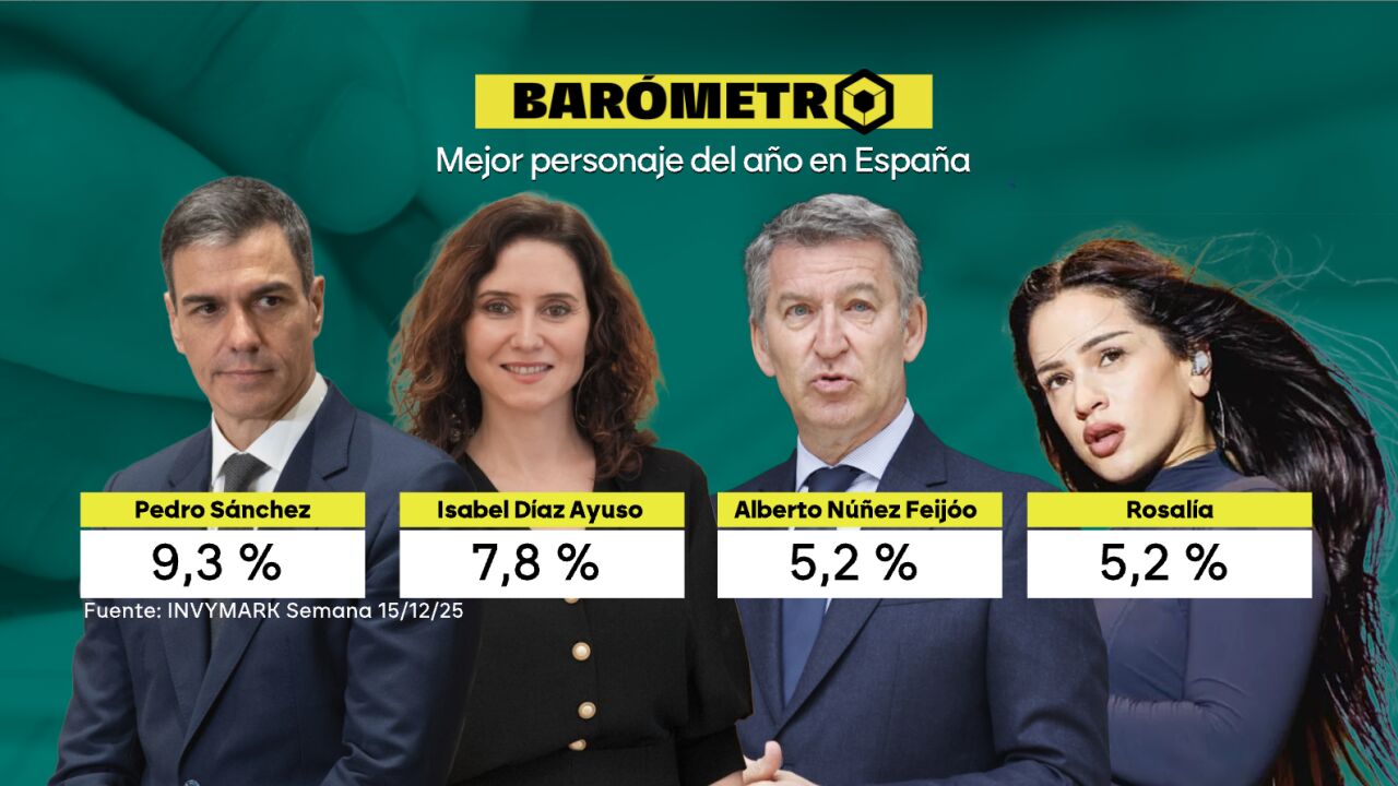 Los detalles En el ámbito nacional, el presidente del Gobierno se sitúa como el mejor personaje de 2025 en España con el 9,3% de los votos. Tras él, la presidenta de la Comunidad de Madrid, Isabel Díaz Ayuso, que obtiene un 7,8%. Las claves: En tercer lugar se sitúa Feijóo con un 5,2%, el mismo porc...