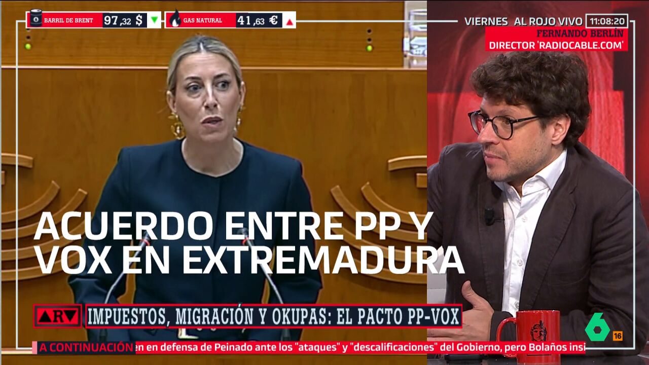 El periodista Fernando Berlín reflexiona sobre el acuerdo alcanzado entre PP y Vox en Extremadura, en el que Vox asume la vicepresidencia y dos consejerías. En el vídeo, los detalles. Ángeles Caballero reflexiona sobre las consecuencias del acuerdo PP-Vox en Extremadura: "¿En qué papel queda Guardio...