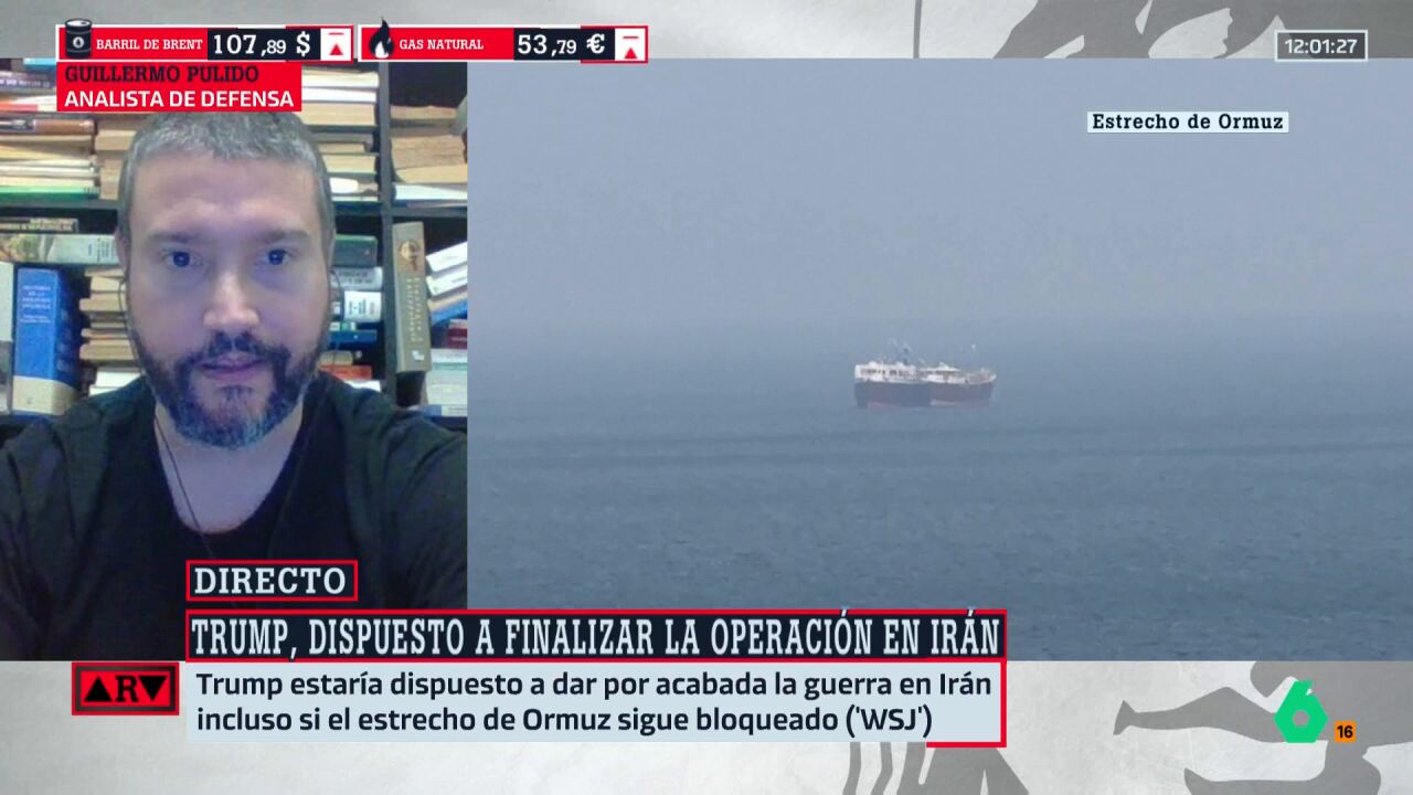Guillermo Pulido, politólogo y analista de defensa, analiza la intencion de Trump de querer terminar con la guerra. Según ha informado 'The Wall Street Journal', Trump estaría dispuesto a dar por acabada la guerra en Irán incluso si el estrecho de Ormuz sigue bloqueado....