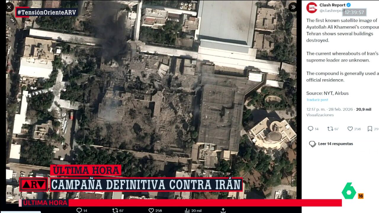 Tras la reciente ofensiva militar de EEUU e Israel contra Irán, comienzan a llegar las primeras imágenes vía satélite. Al Rojo Vivo recoge la fotografía que muestra cómo ha quedado la casa del ayatolá iraní, el líder supremo de la revolución. Las claves: Sánchez rechaza la "acción militar unilateral...
