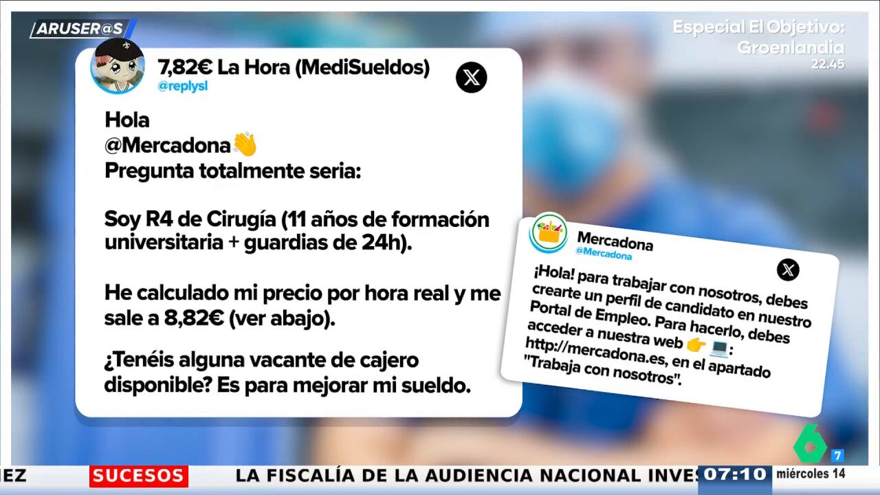 Un médico residente de cuarto año de cirugía ha sacado la calculadora y ha descubierto que, al menos económicamente, le conviene más ser cajero en Mercadona que trabajar en lo suyo. Un tuit viral que recoge Aruser@s....