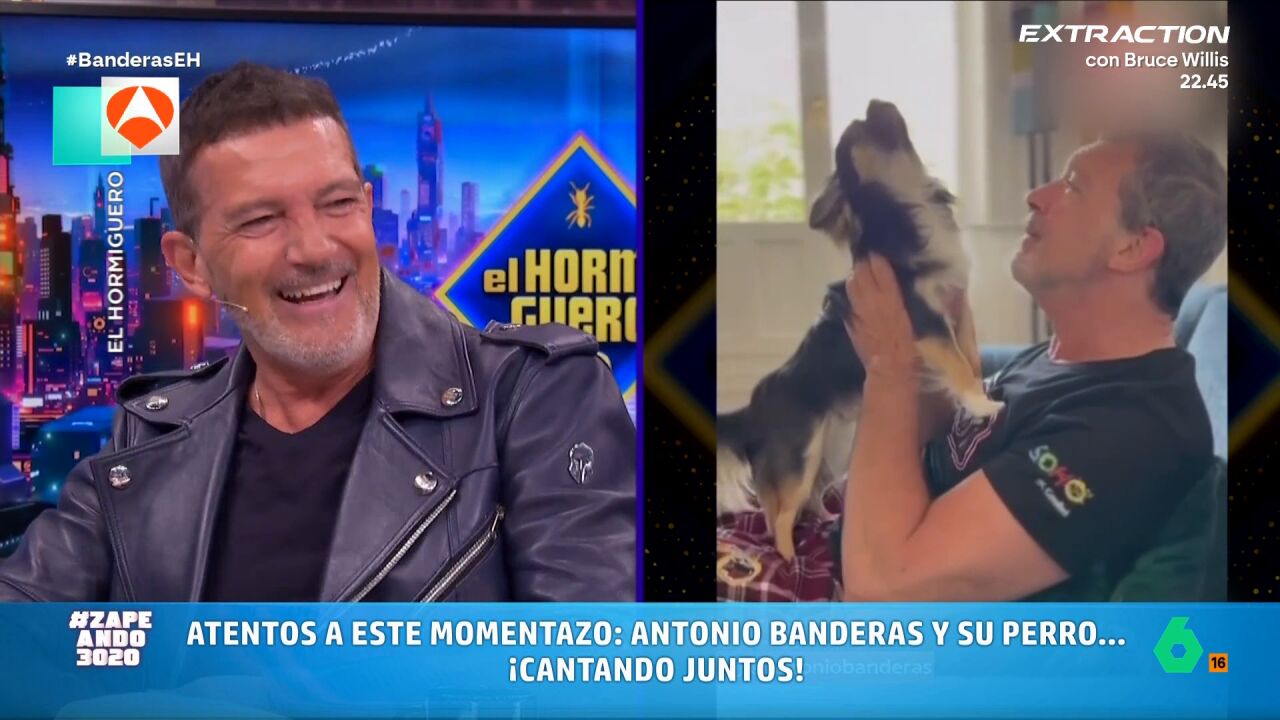 Antonio Banderas presentó en 'El Hormiguero' a 'Gipsy', su perro con el que incluso cantan juntos: "Está muy afinado y muy en tono, y Banderas tampoco lo hace mal. Se le nota Broadway", ironiza Miki Nadal en este vídeo....