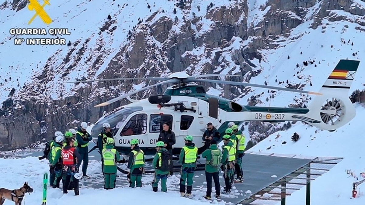 Efectivos de la Benemérita trabajan en la zona del siniestro en el Pirineo oscense tras recibir la alerta de socorro este lunes al mediodía....