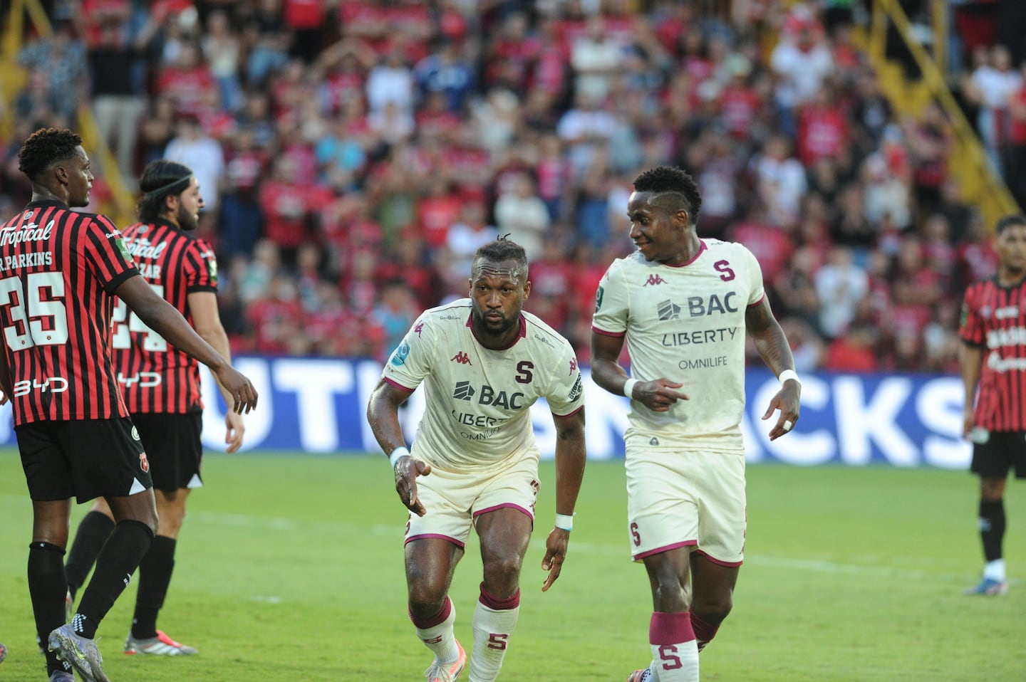 El defensor morado Kendall Waston impuso su físico para abrir el marcador en el clásico, pero un jugador de Alajuelense quedó tendido...