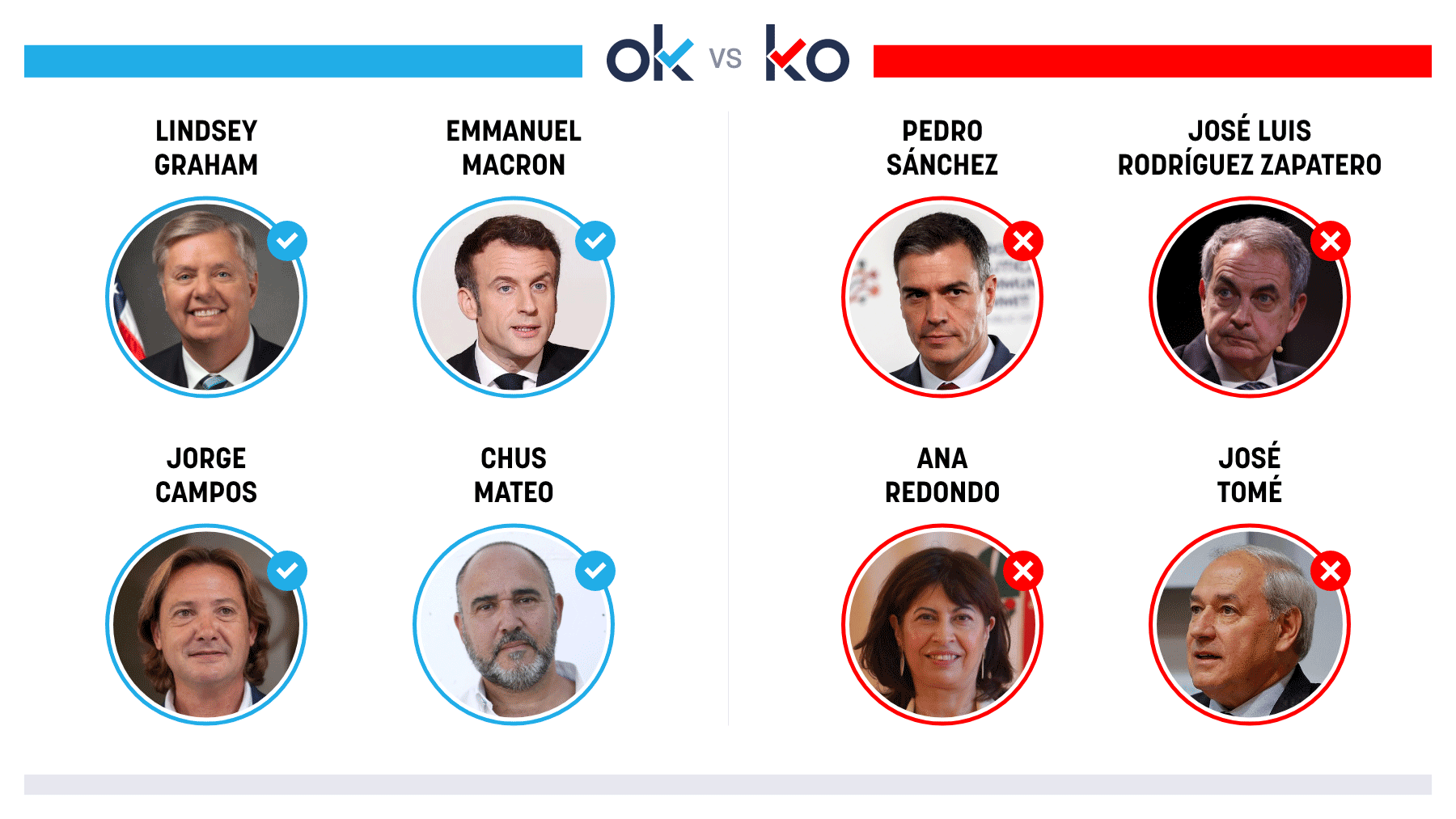 OK: Lindsey Graham Porque este senador de EEUU ha retratado a Sánchez por impedir el uso de las bases a su Ejército: «Ha perdido el rumbo moral». OK: Emmanuel Macron Porque Francia reforzará su arsenal nuclear: «No dudaré en usarlo para proteger nuestros intereses». OK: Jorge Campos Porque denu...