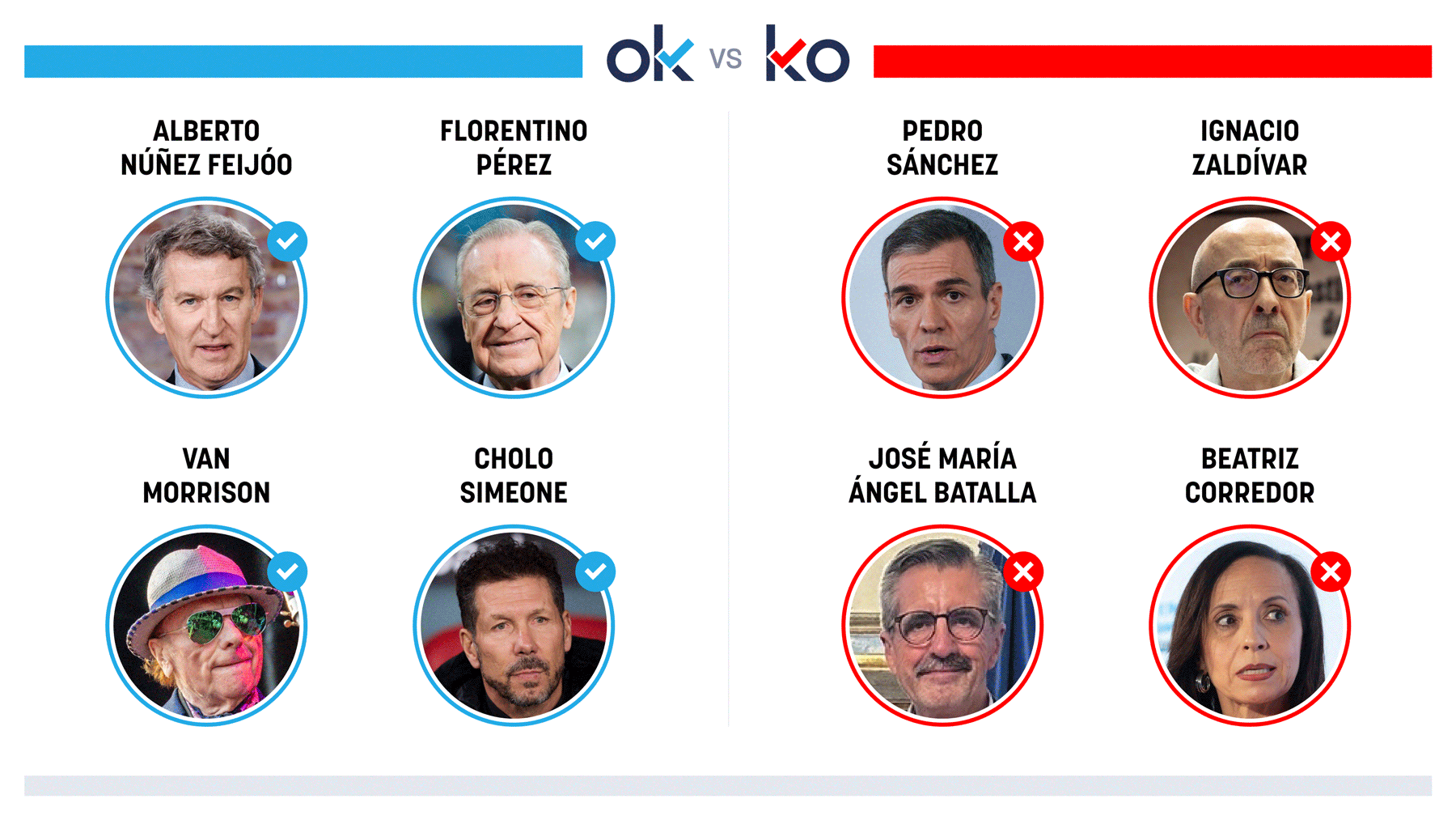 OK: Alberto Núñez Feijóo Por anunciar que bajará el IRPF, entre otros impuestos: «Si no se roba dentro del Gobierno, hay margen». OK: Florentino Pérez Porque Cimic (ACS) construirá un data center a gran escala en Malasia. OK: Van Morrison Porque el ‘León de Belfast’ se ha sumado al cartel del F...