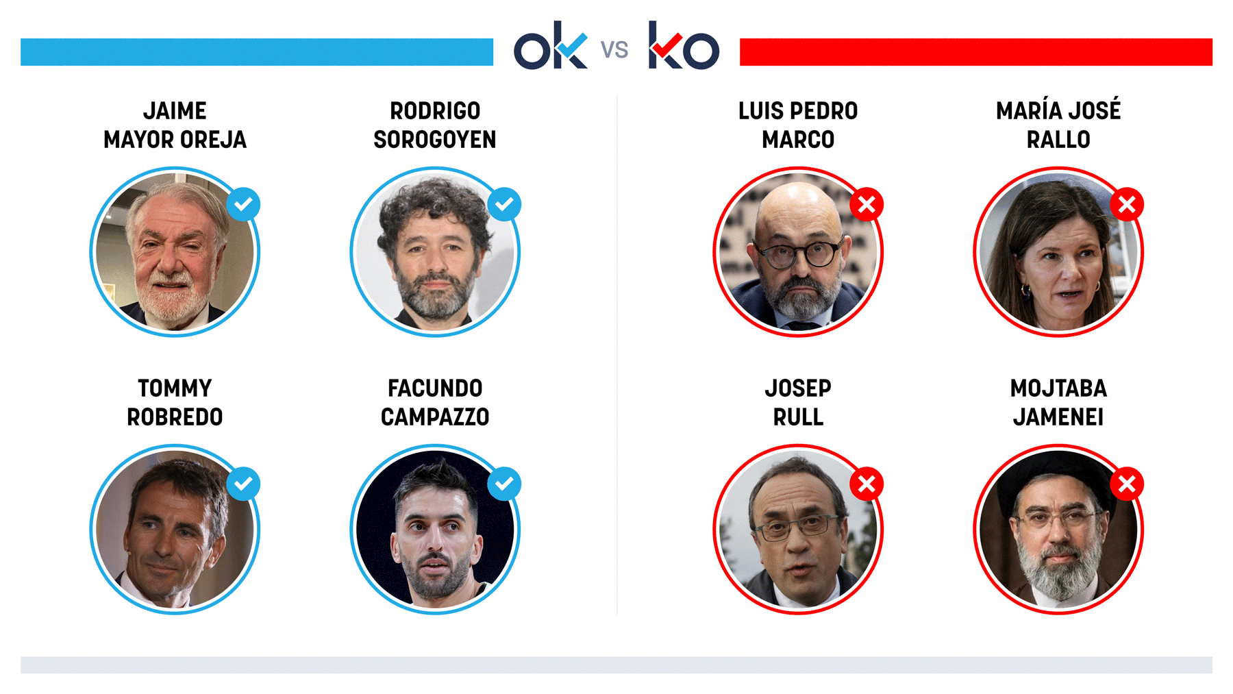 OK: Jaime Mayor Oreja Porque ha presentado su libro ‘Una verdad incómoda’ acompañado por dirigentes del PP y de Vox. OK: Rodrigo Sorogoyen Porque competirá por la Palma de Oro en Cannes junto a Pedro Almodóvar y los Javis. OK: Tommy Robredo Porque el Conde de Godó de tenis afronta una nueva edi...