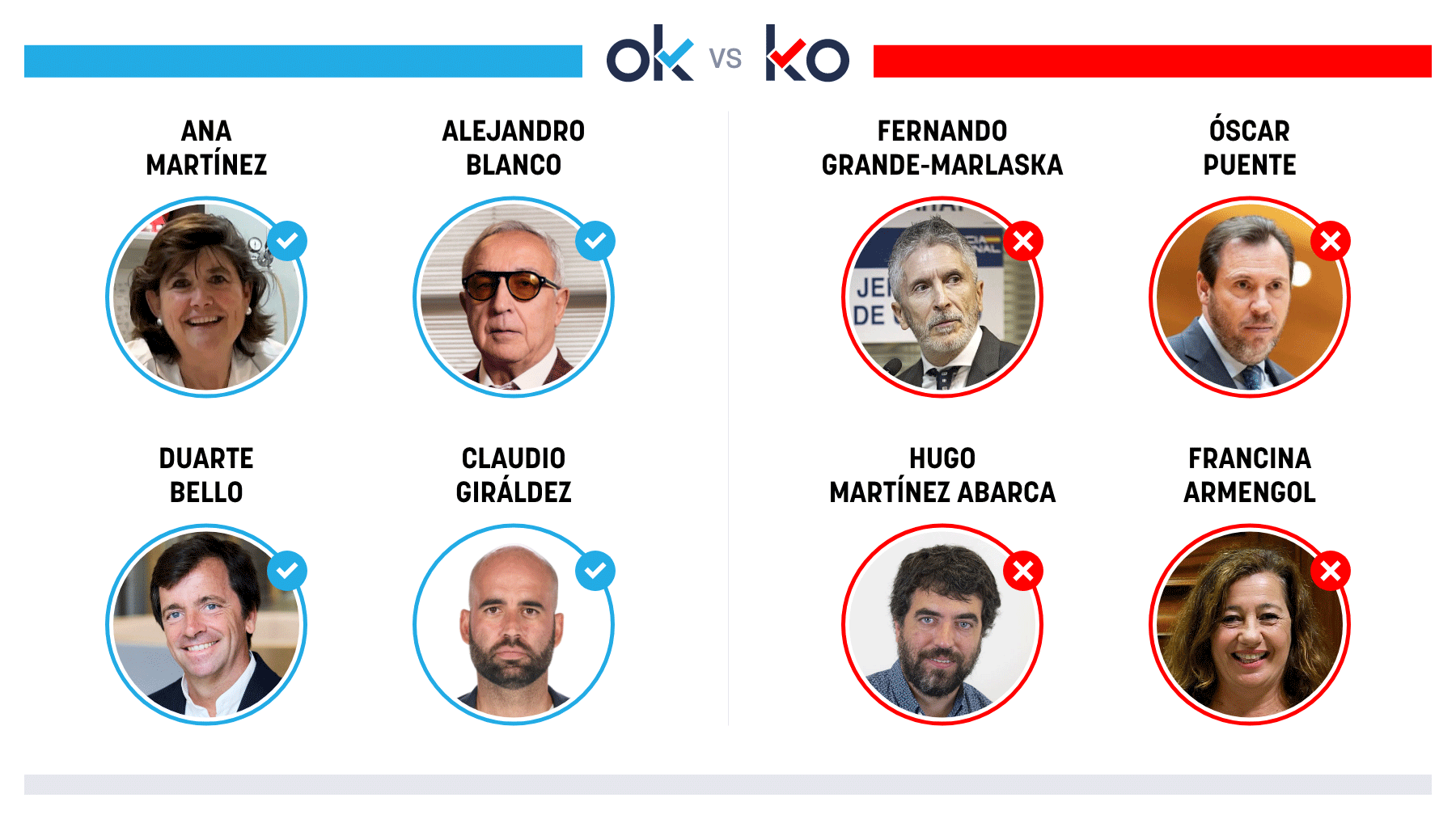 OK: Ana Martínez Porque el CSIC ha creado un fármaco contra la ELA cuyo ensayo clínico comenzará este año. OK: Alejandro Blanco Por apelar a la unidad para que el Mundial de 2030 que lidera España sea un éxito. OK: Duarte Bello Porque ha sido nombrado nuevo consejero delegado de EDP España. OK...