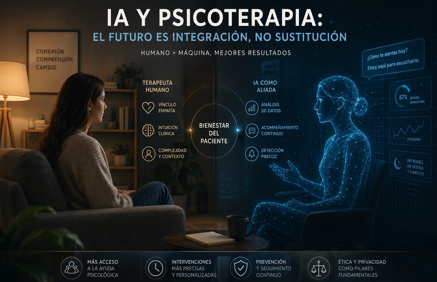 La relación entre inteligencia artificial y psicoterapia no es una promesa futura: ya está ocurriendo. Pero conviene separar rápido el ruido del valor real, porque aquí hay mucho hype mal entendido. La IA no va a sustituir a los terapeutas en el corto plazo. Tampoco va a quedarse como una simple her...