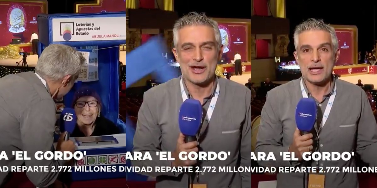 Una anciana se cae de bruces tras ser entrevistada durante el sorteo de la Lotería de Navidad y el reportero de Telecinco sigue a su bola