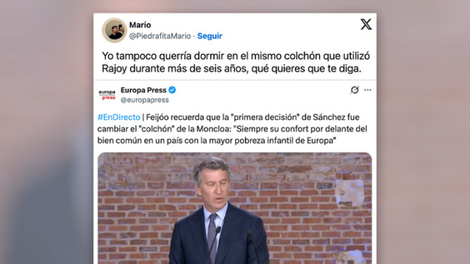 Feijóo vuelve a superarse, ahora con sus críticas a Sánchez por cambiar el colchón al llegar a la Moncloa: "El que le monta los discursos es su peor enemigo" 9 abr 2026, 12:10 ... Redirecting to full article...