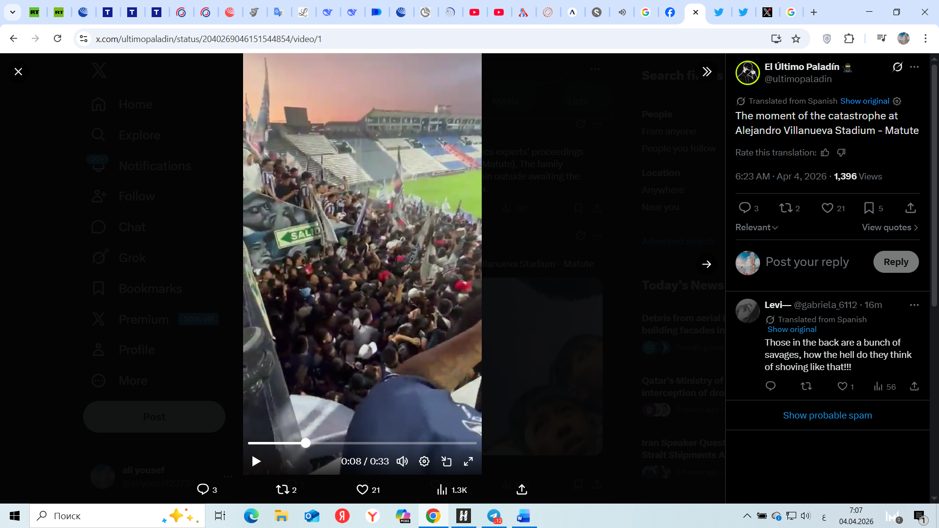 أعلنت وزارة الصحة في بيرو عن وقوع حادثة في ملعب "أليخاندرو فيلانويفا" في العاصمة ليما أسفر عن إصابة 47 شخصا ولا تزال التحقيقات جارية لمعرفة أسبابه....