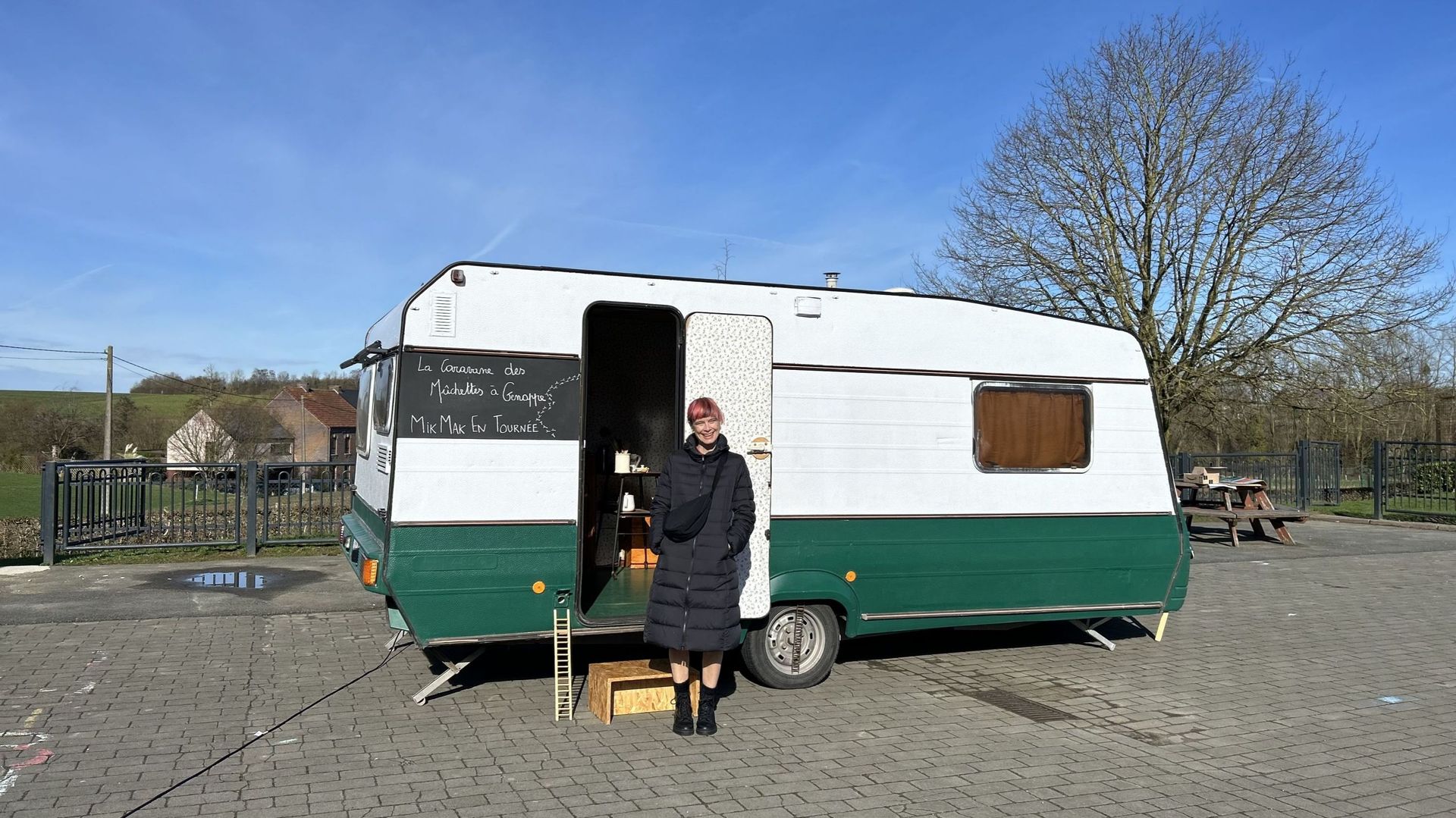 La caravane est installée dans la cour de l’école de Loupoigne, entourée de champs, un endroit idyllique en ce dimanche ensoleillé. La porte de la caravane s’ouvre sur un minuscule théâtre avec ses petits gradins moelleux qui font face à une cuisine vintage en bois. "C’est un théâtre caché, sourit l...